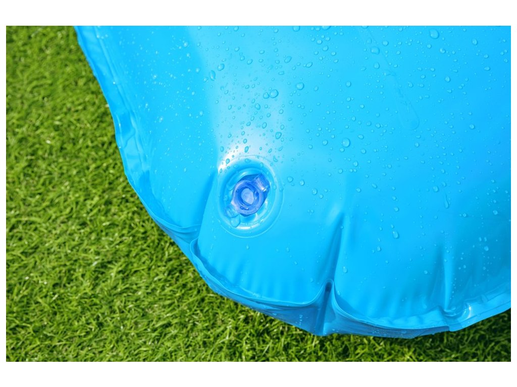 Dovolj je, da razvijete drčo, jo pritrdite na tla in priključite vrtno cev. Zahvaljujoč posebnim varnostnim elementom, ki so vključeni v komplet, bo drča ostala na mestu. Drča je dolga 4,88 m, zato je idealna za tekmovanja ali igre v zavojih s prijatelji. Rezervoarji za vodo na koncu drče povzročijo spektakularen pristanek z velikim pljuskanjem na ciljni liniji. Vgradne podloge so posebej zasnovane za učinkovitejšo porazdelitev vode in zagotavljajo kaskadni učinek, hkrati pa ohranijo spolzko pot.