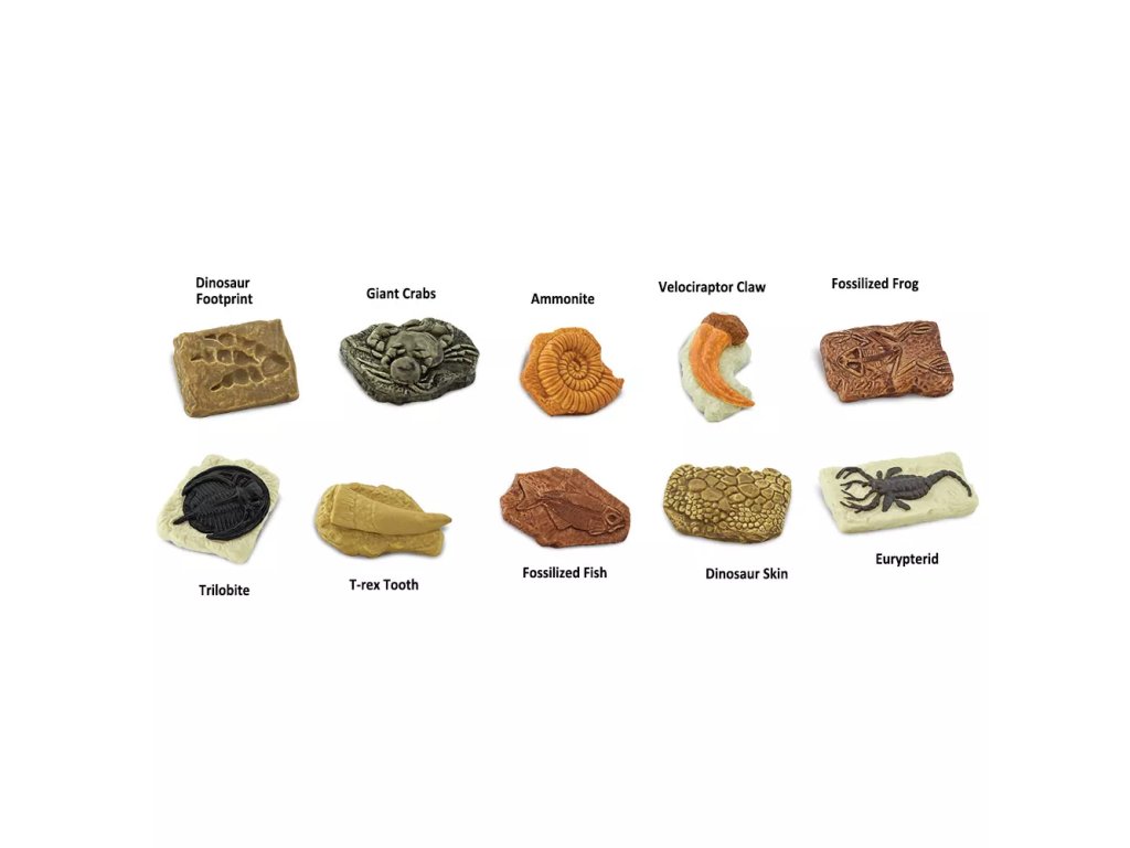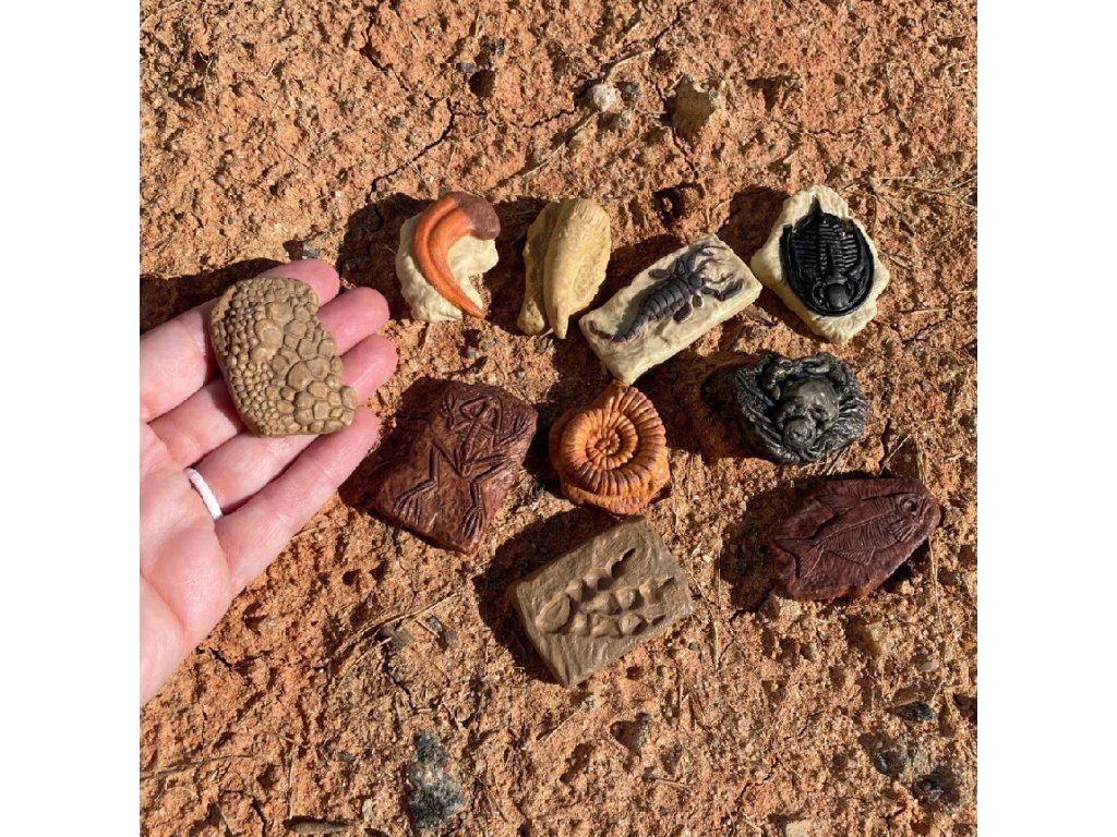 Komplet desetih ročno poslikanih modelov fosilov, namenjenih spoznavanju, ustvarjanju in igram v duhu paleontologije. Modeli spodbujajo k raziskovanju, izkopavanju, vtiskovanju v plastelin in opazovanju podrobnosti.