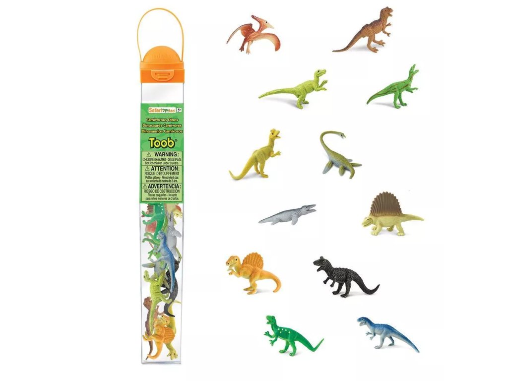 Kolekcija Safari Ltd. TOOBS predstavlja zbirko ročno poslikanih miniaturnih replik živali, izdelanih s poudarkom na zvestobi in detajli. Tuba »Mesožraví dinosauři« vsebuje 12 figuric v velikosti približno 4–7,5 cm. Imena živali so običajno navedena na trebuhu figurice v angleščini.