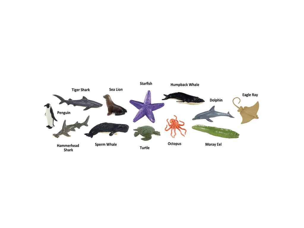 Tuba vsebuje 11 ročno poslikanih figuric morskih živali, ki privabljajo otroke k raziskovanju podvodnega sveta. Modeli so izdelani v podrobnostih in otroku pomagajo prepoznati tipične značilnosti posameznih vrst.