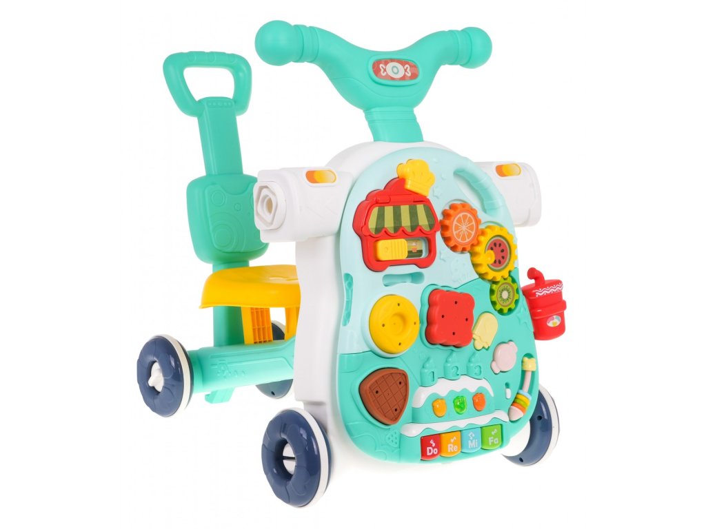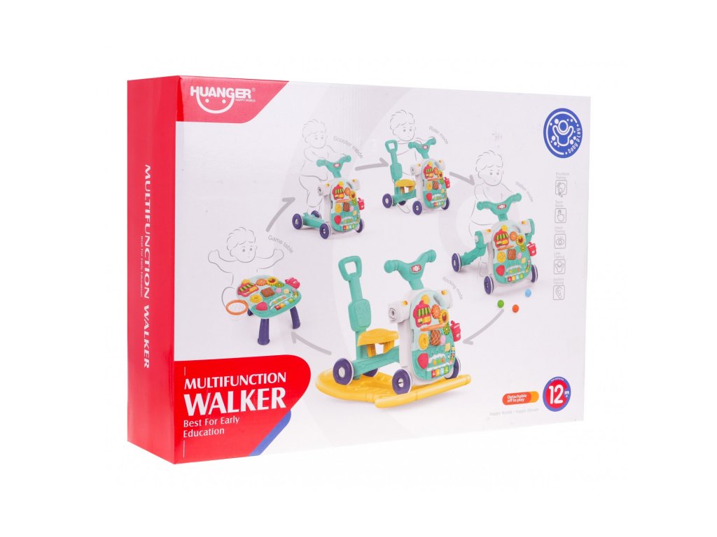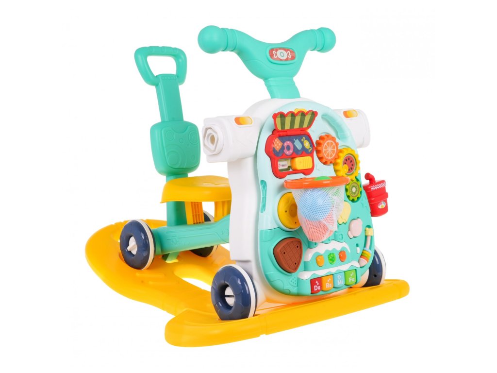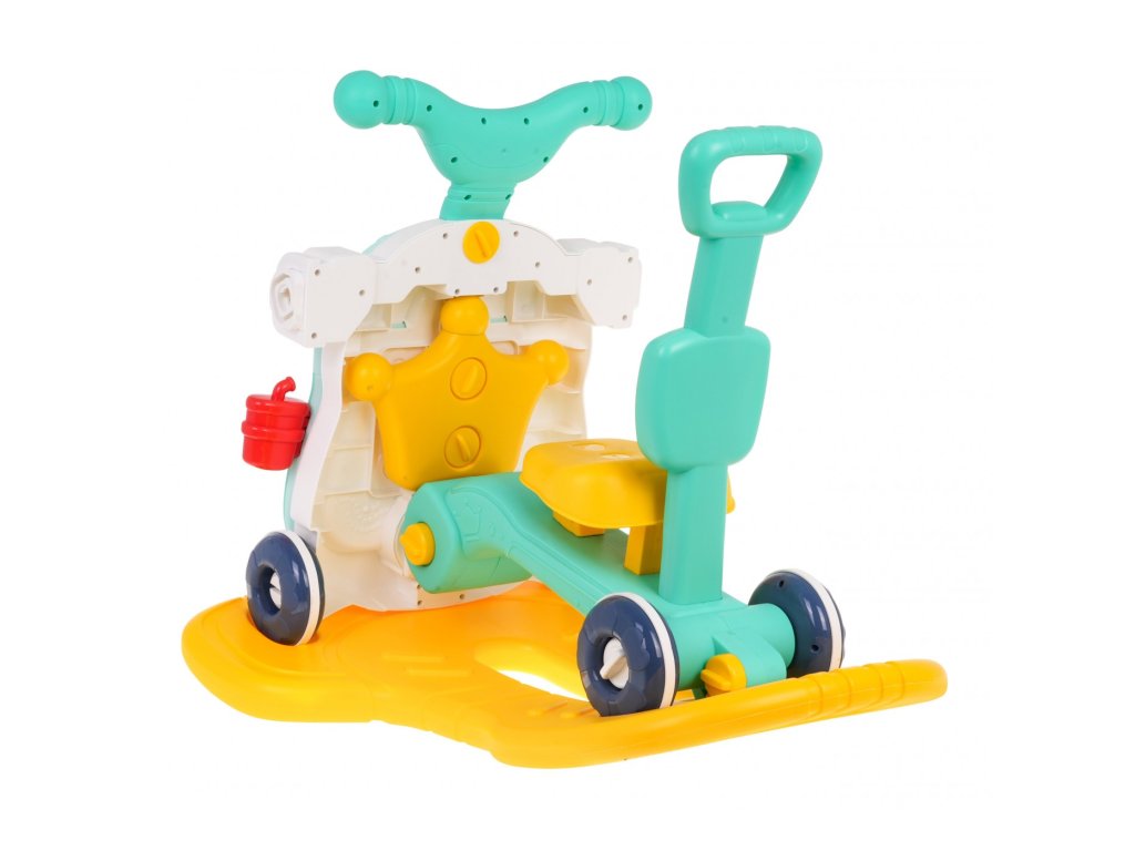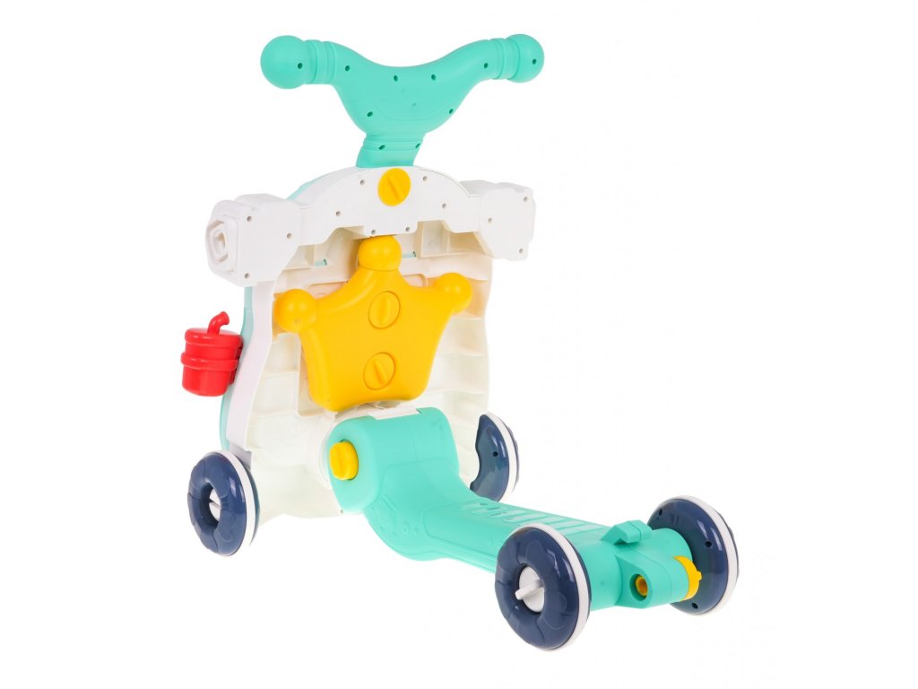 Iz seta lahko ustvarite pet različnih igrač: hojico, poganjalca, gugalni stol, skiro ali večnamensko mizo. Ta komplet spodbuja vašega otroka k temu, da sedi, stoji in dela prve korake. Večnamenski set bo dragocen za otroke v različnih fazah razvoja.