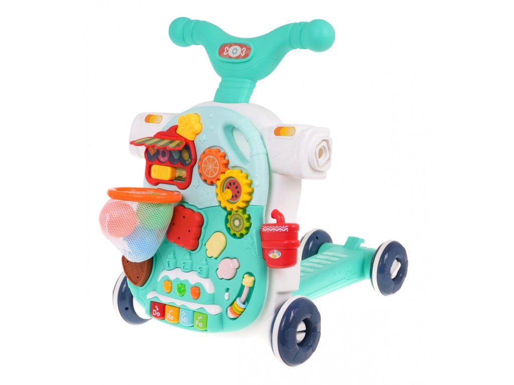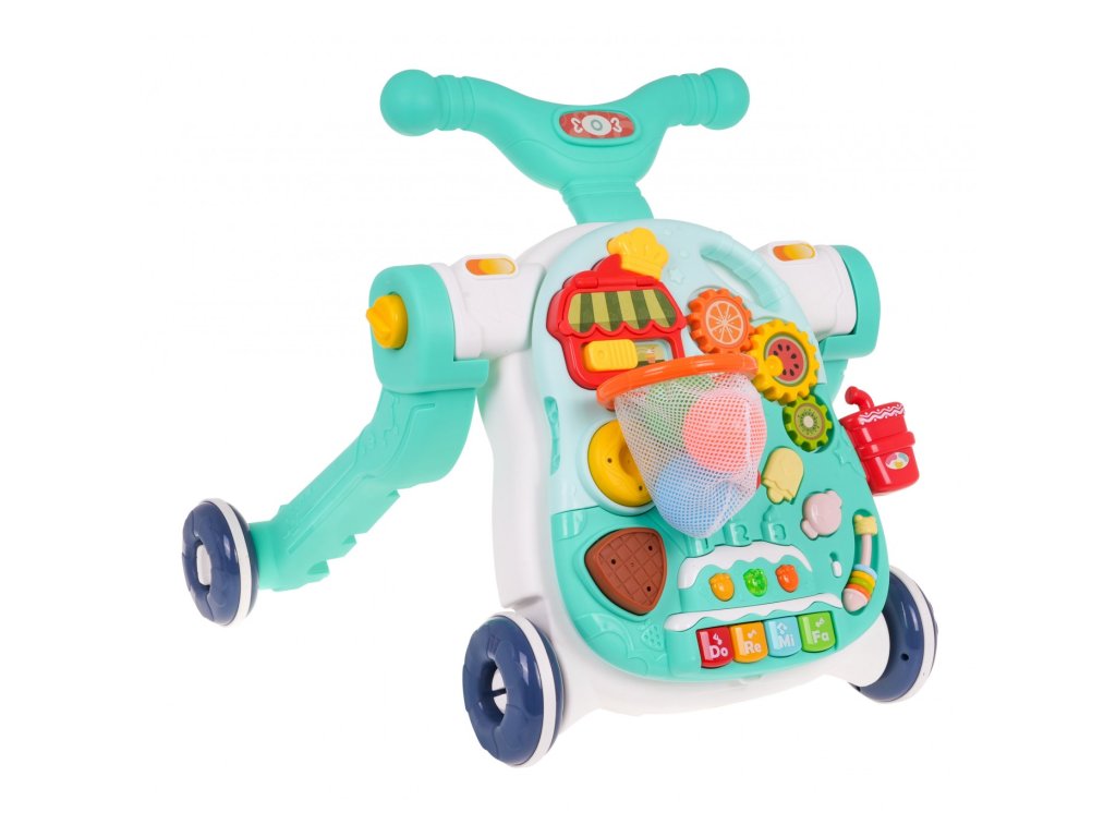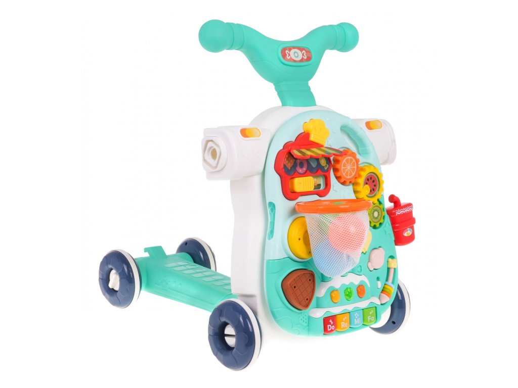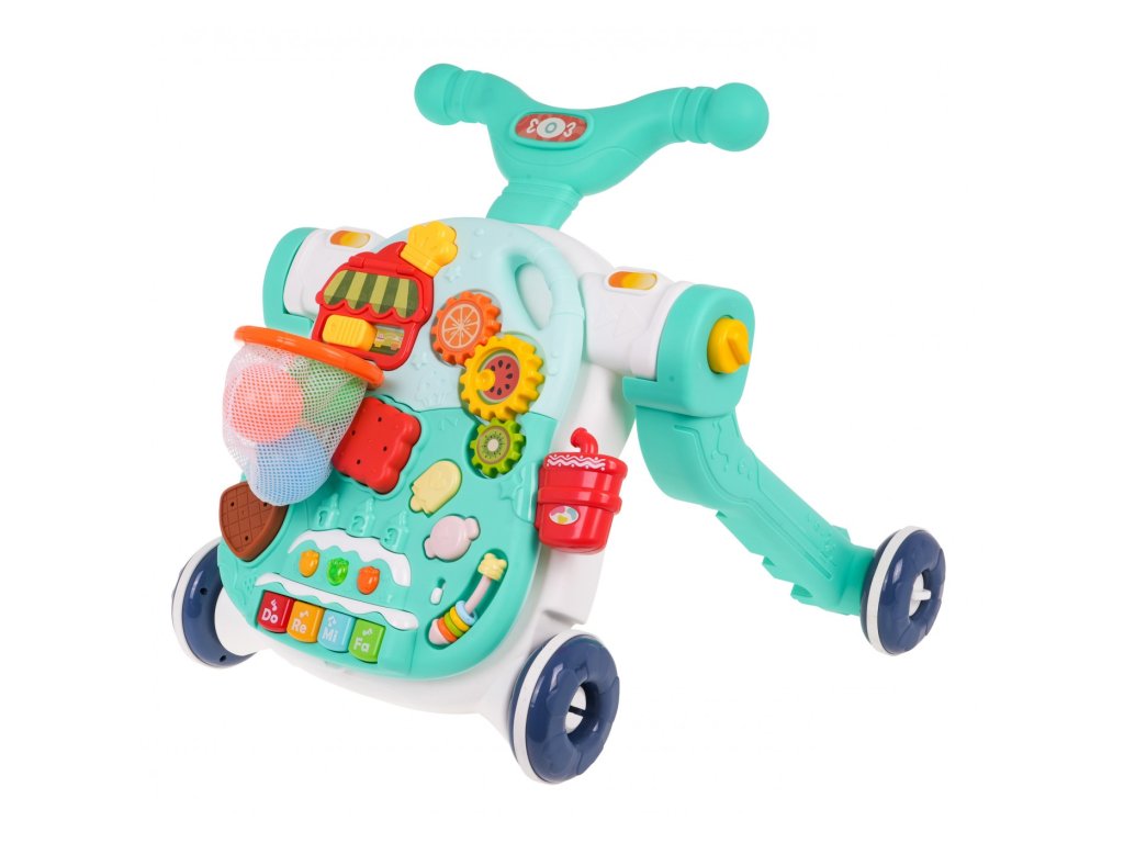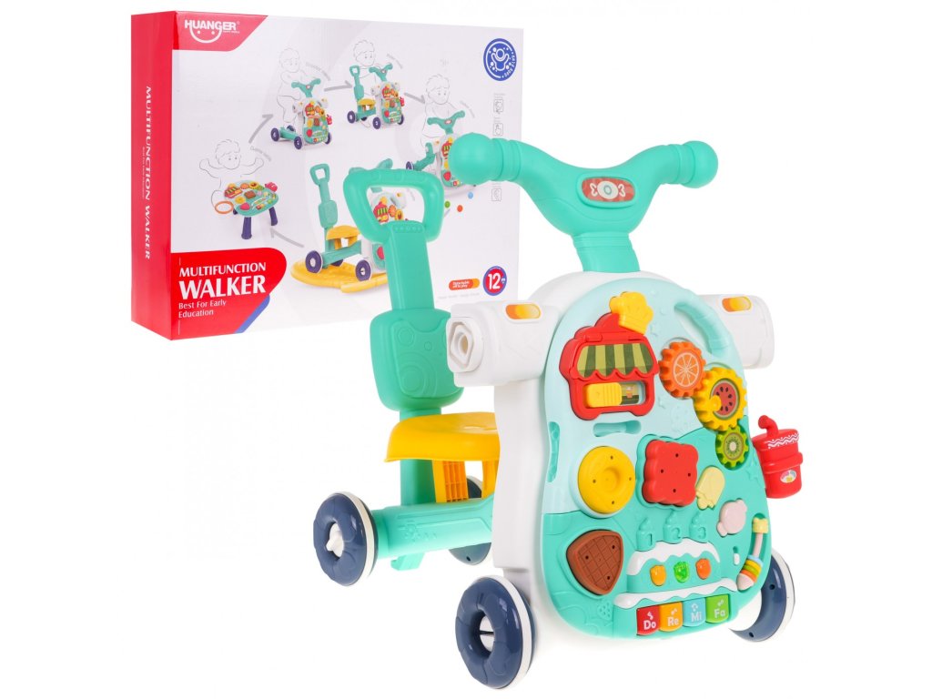 Iz seta lahko ustvarite pet različnih igrač: hojico, poganjalca, gugalni stol, skiro ali večnamensko mizo. Ta komplet spodbuja vašega otroka k temu, da sedi, stoji in dela prve korake. Večnamenski set bo dragocen za otroke v različnih fazah razvoja.