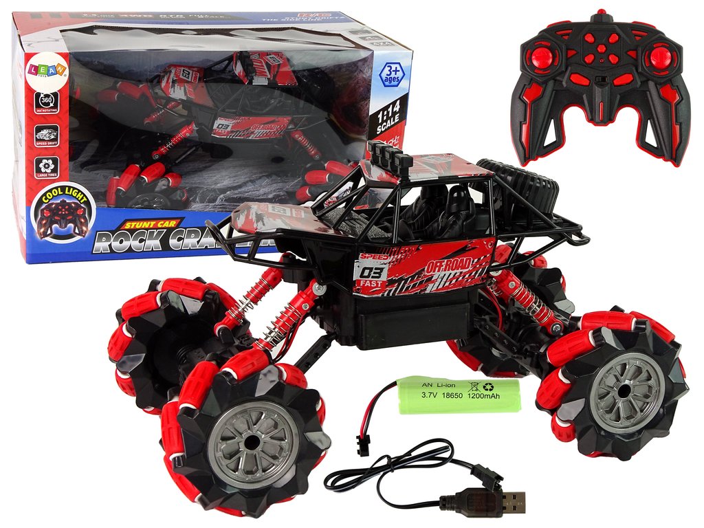 Črn upravljalnik z rdečimi gumbi je lahek, praktičen in idealen za majhne rokice. Njegove dimenzije so: 13 cm x 10 cm x 4 cm. Dimenzije avtomobila so 29 cm x 18 cm x 16 cm. Komplet vključuje avtomobilček, upravljalnik, akumulator 3.7V 1200mAh in polnilec z USB vhodom za polnjenje akumulatorja.