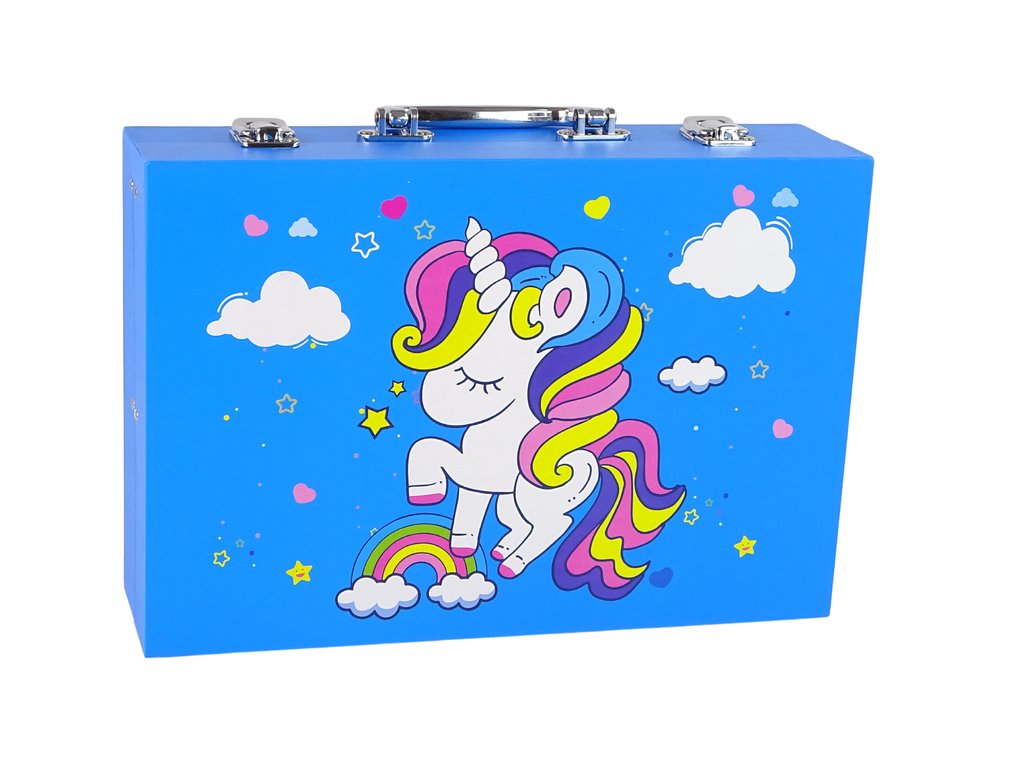 Kreativna zabava za vse - kompletna zbirka barvic, barv, flomastrov! Naš set v kovčku s prikupnim samorogom vsebuje vse potrebne umetniške pripomočke v različnih barvah. Set je velik in vsebuje kar 145 delov, da otroku nič ne manjka pri ustvarjanju svojih mojstrovin. Vse v enem kovčku z najljubšim motivom samoroga, ki ga otroci obožujejo. Kovček je enostavno prenosljiv zahvaljujoč ročaju na vrhu.