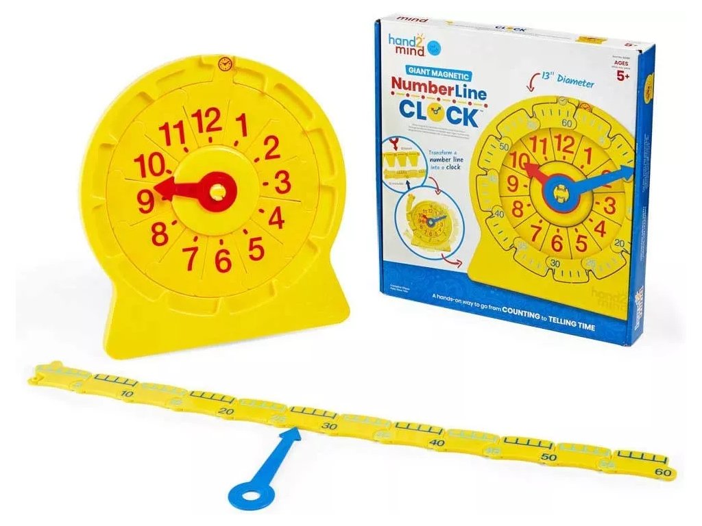 Vzdržljiva plastična magnetna ura omogoča učitelju, da fizično preoblikuje neposredno številčno vrsto v okroglo številčnico in jo postavi na podstavek ure. Komplet vsebuje odstranljive številke številčnice in odstranljive kazalce, ki jih učenci nameščajo na podstavek.