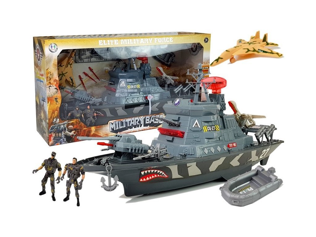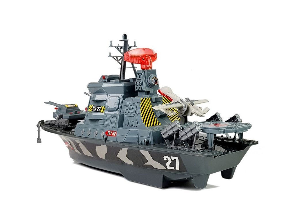 Velika vojaška ladja za ljubitelje bitk. Set razvija domišljijo, kreativnost in omogoča igralcem, da organizirajo velike vojaške bitke. Ladja vsebuje 4 gumbe, vsak sproži zvočne efekte in različne kombinacije svetlobnih efektov. Slišali boste zvoke morja, streljanja, alarmov in kapitana ladje.