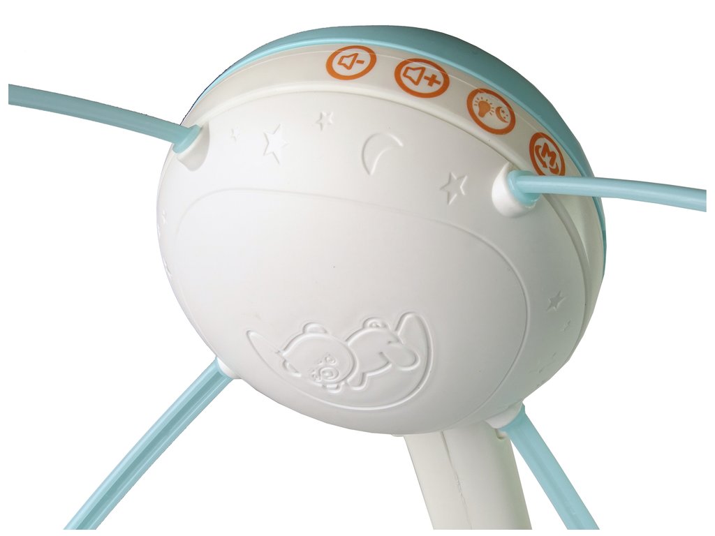 Ta pravljica barvit vrtiljak nad posteljico je odličen prijatelj za vašega malčka, ki mu bo pomagal zaspati. Prijetne melodije in nočna lučka bosta vašega otroka pomirili, medtem ko ga lahko vi nadzorujete pri ugasnjeni luči zahvaljujoč funkciji projektorja. Vrtiljak lahko pritrdite na posteljico vašega otroka ali na voziček, ko greste na sprehod. Igrača ima nadzor glasnosti. Zaradi nastavljivega ročaja je primerna za večino rešetkastih posteljic. Na dnu naprave je nameščeno ogledalce, v katerem se lahko otrok občuduje.