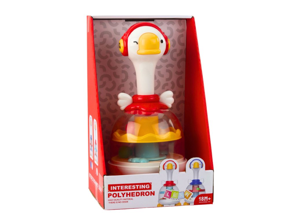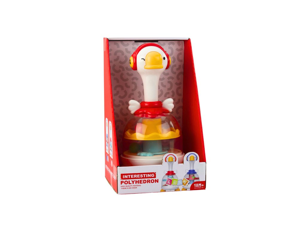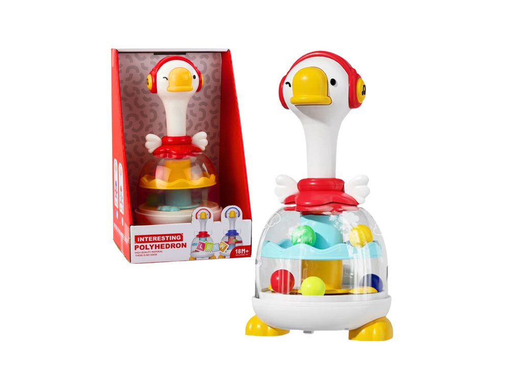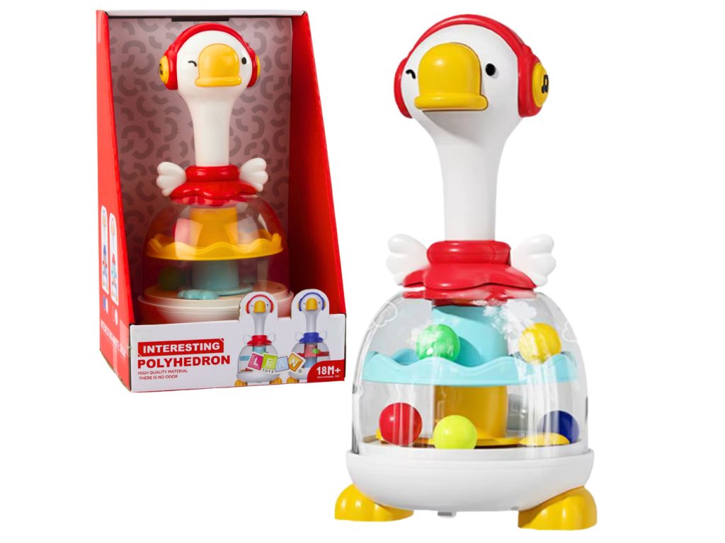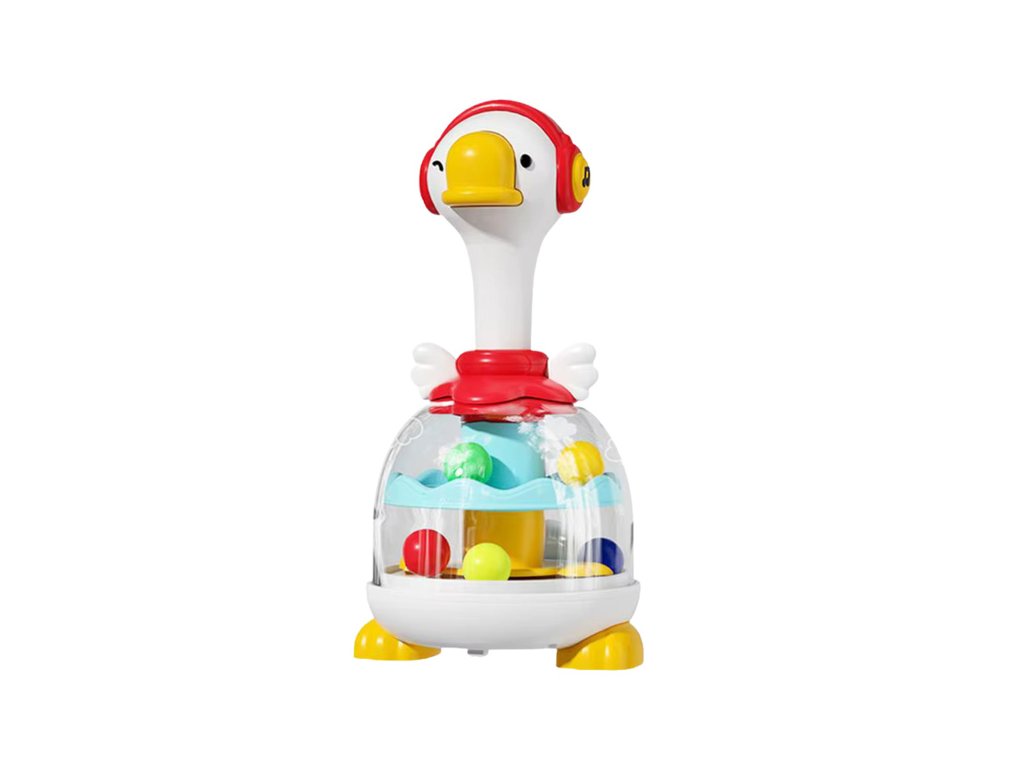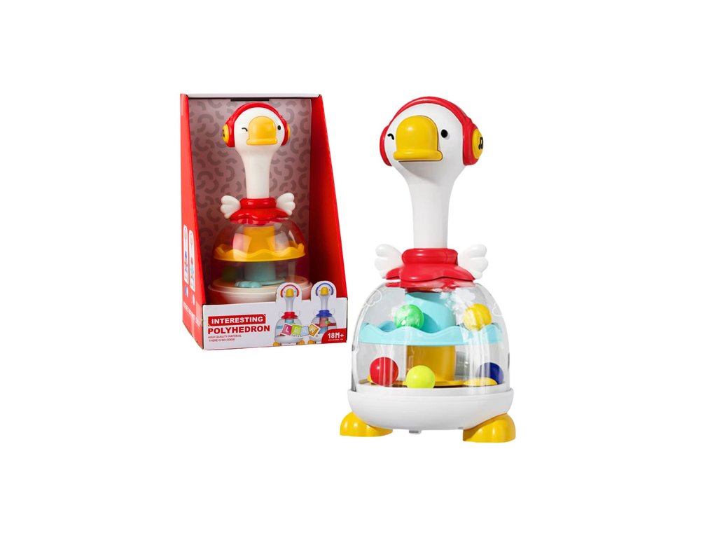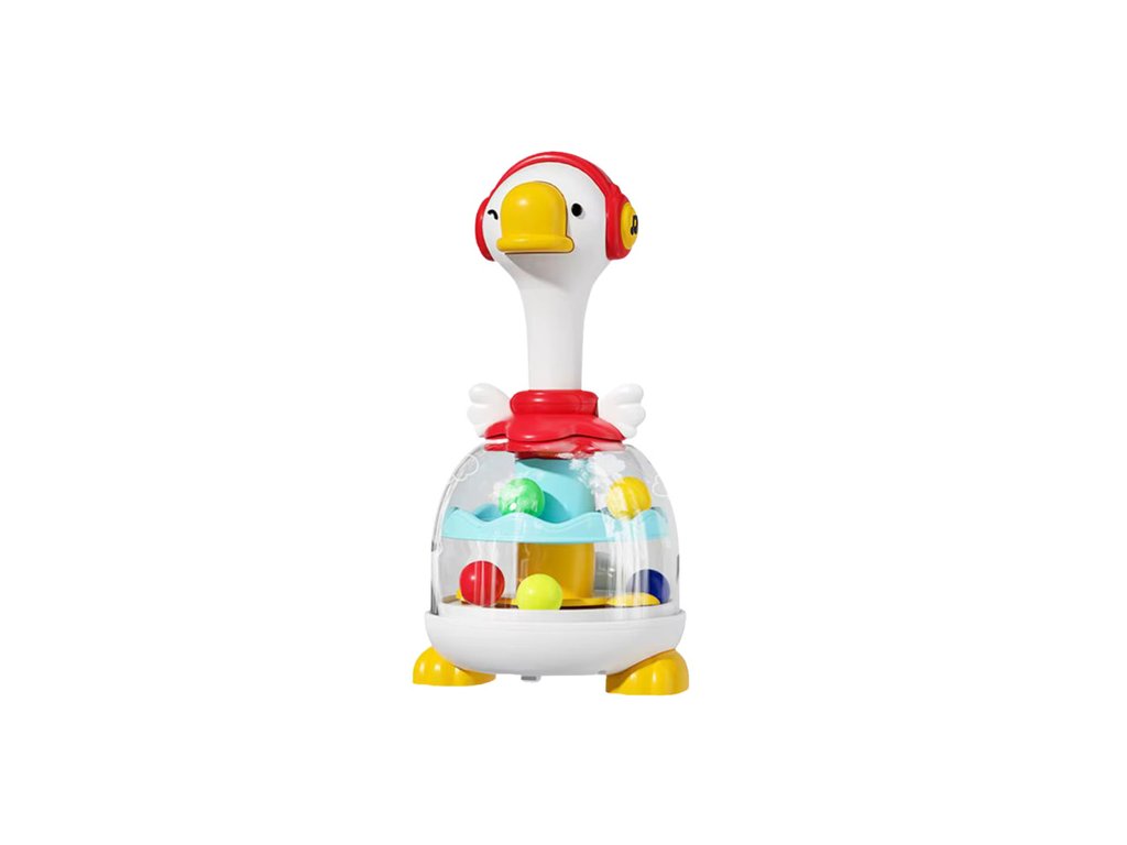 Vrtiljak z žogicami v obliki gosi je edinstvena izobraževalna igrača, ki združuje enostavno uporabo in odlično zabavo za malčke. Ko pritisnete na glavo igrače, se aktivira vrtljiv mehanizem, ki sproži gibanje pisanih žogic znotraj prozorne kupole. To spremljajo svetlobni in zvočni učinki , ki učinkovito pritegnejo otroško pozornost in spodbujajo njihove čute.