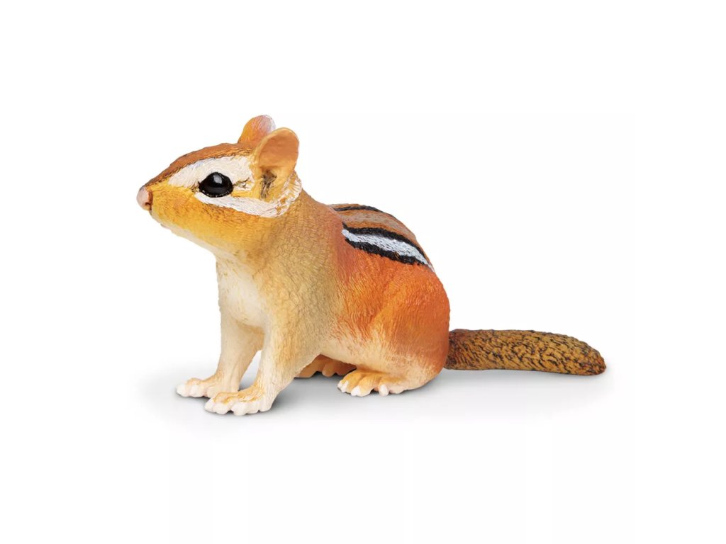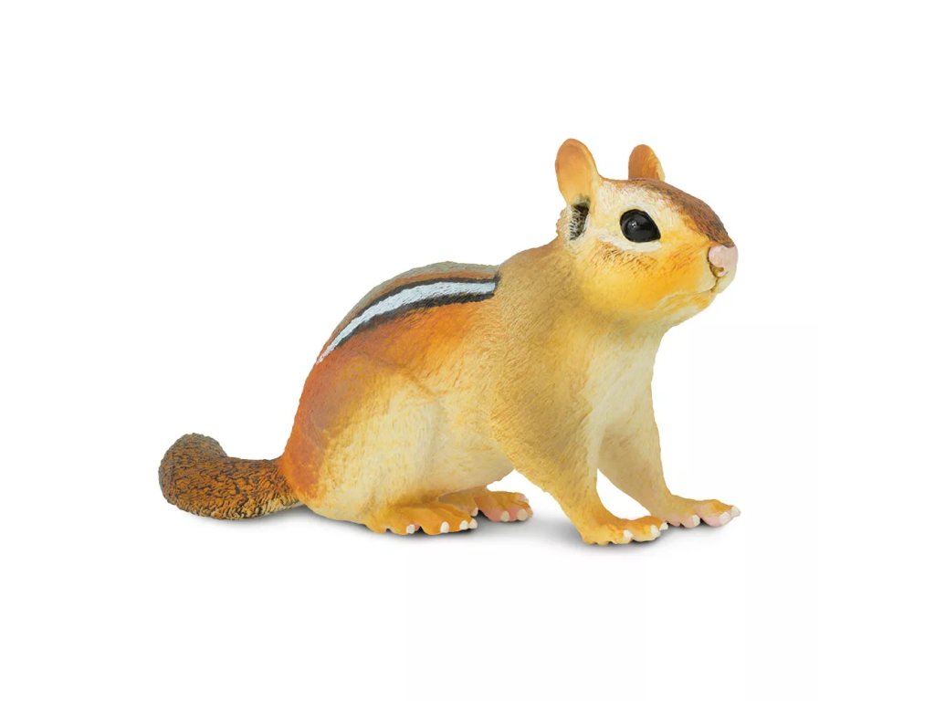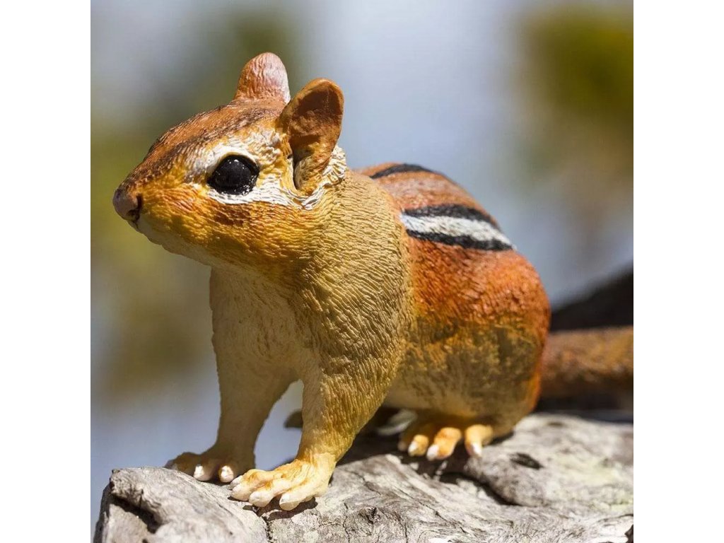 Majhna figurica čipmanka, profesionalno oblikovana in ročno poslikana. Ko figurica pokuka ven, je opazno piskanje in trepetanje; natančna obdelava poudarja realističen videz modela.