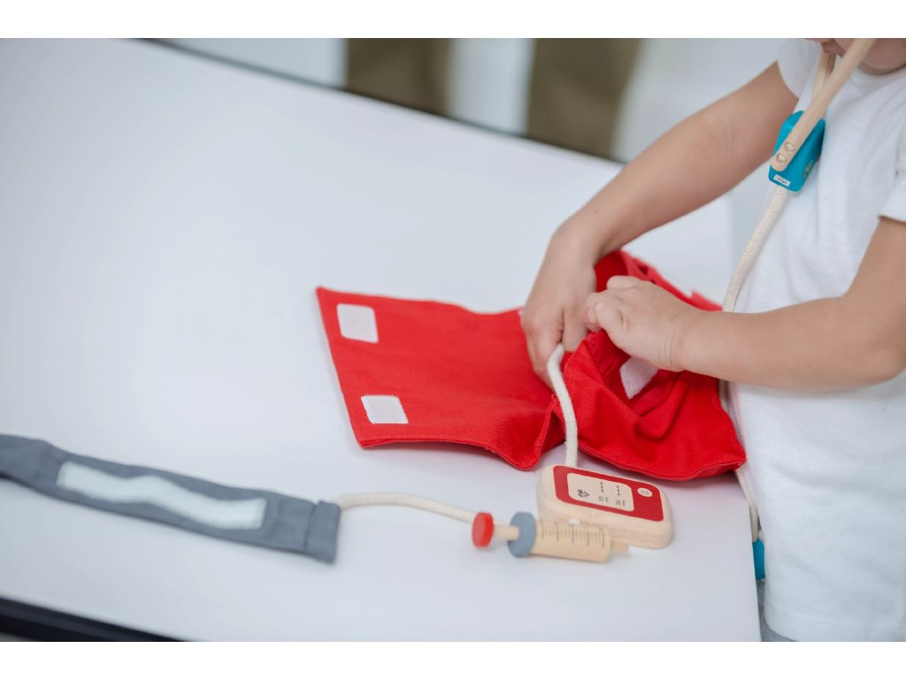 Priročen zdravniški kovček Plan Toys je zasnovan za otroške igre zdravnika. Vsebuje osnovna orodja, ki otrokom omogočajo, da skrbijo za svoje prijatelje in vadijo socialne veščine.