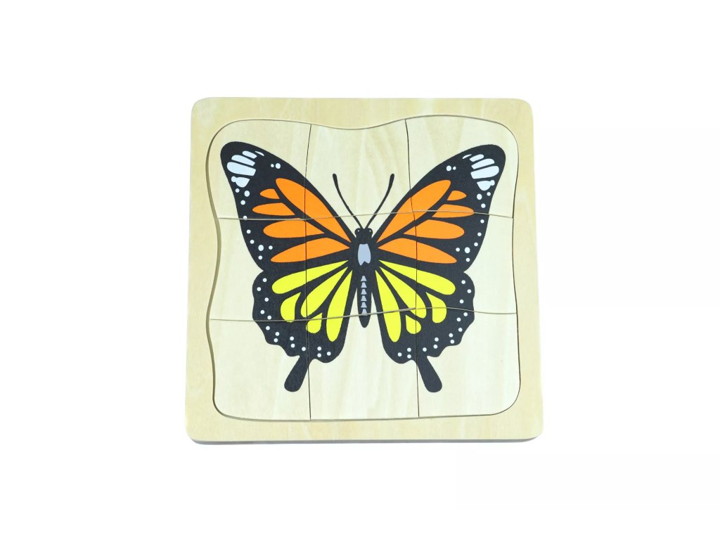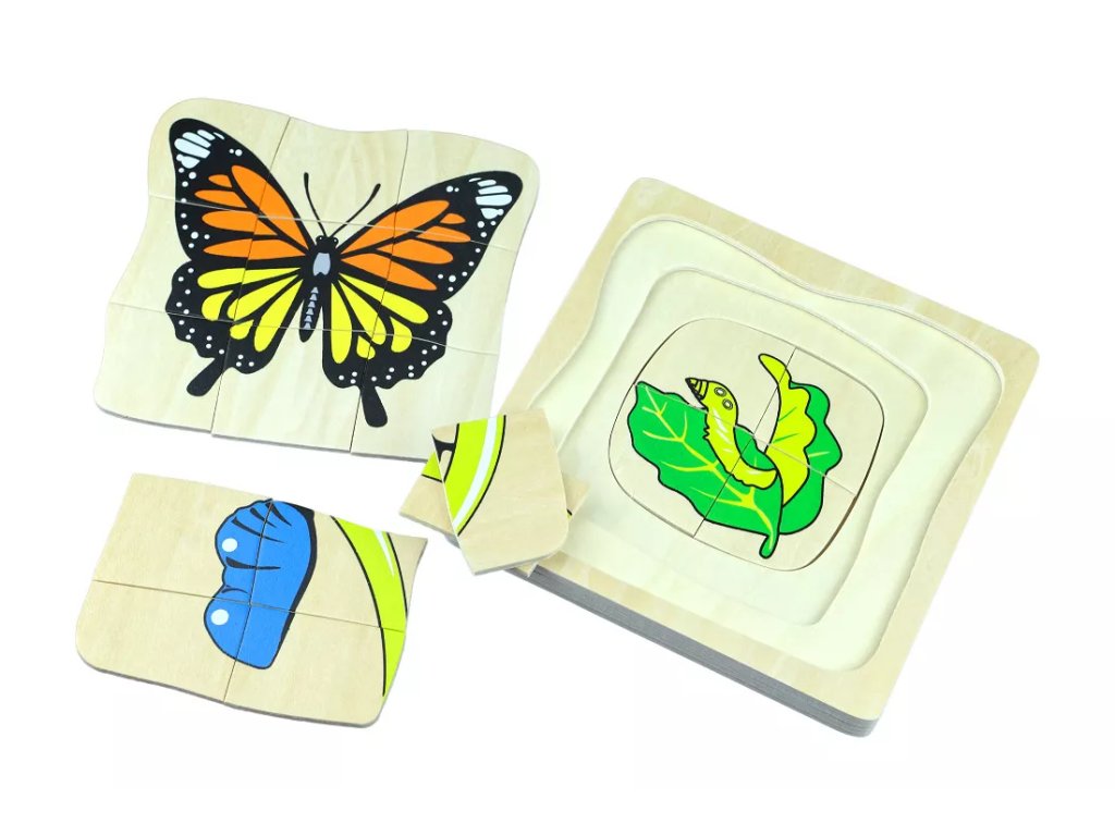 Montessori pripomoček, ki prikazuje razvoj metulja v plasteh. Primerno za razvoj osnovnih spretnosti majhnih otrok.