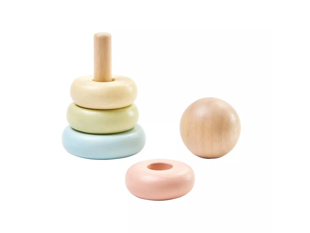 Stohovalni obroči PlanToys v nežnih pastelnih barvah pomagajo majhnim otrokom spoznavati velikosti in barve ter hkrati razvijati fino motoriko, koordinacijo in potrpežljivost.